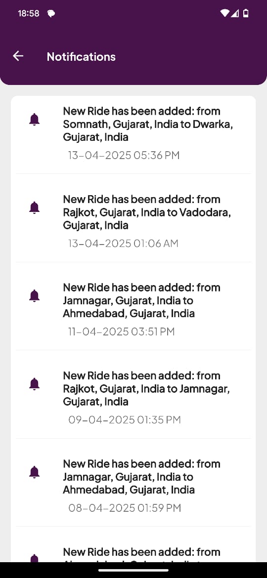 Push notifications alert users to new ride requests, confirmations, cancellations, and driver check-ins—powered by Firebase Cloud Messaging (FCM).